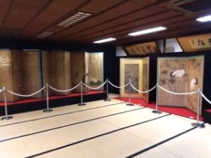 屏風は、菜香亭に伝わる江戸時代から昭和時代に描かれたもので、前期(9月)は、伝雲谷等益作の「山水人物花鳥図屏風」、大庭学僊の「松鶴図屏風」など7点、後期(10月)は、狩野幸信の「群鶴図屏風」、蘆山の「秋草花図屏風」など8点が展示されました。